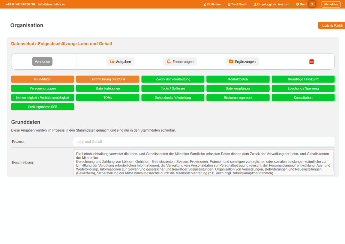 Mit unserem Modul für Datenschutz-Folgenabschätzung (DSFA) bewerten und dokumentieren Sie Risiken sowie Auswirkungen risikobehafteter Prozesse einfach und transparent. Ein intuitiver Prozess führt Sie Schritt für Schritt durch die Bewertung und unterstützt Sie dabei, Risiken präzise zu identifizieren und gezielte Maßnahmen zur Minimierung zu definieren. Die strukturierte Dokumentation stellt sicher, dass Sie Ihren Nachweispflichten jederzeit gerecht werden.