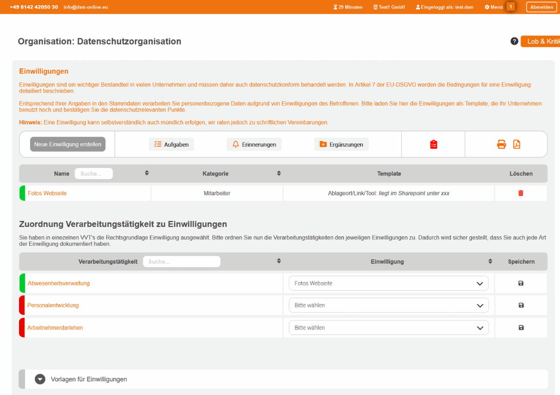 Mit unserem Modul für Einwilligungen erfassen und dokumentieren Sie sämtliche Einwilligungserklärungen an einem zentralen Ort. Nutzen Sie praktische Checklisten, um die Einhaltung der DSGVO zu überprüfen, und behalten Sie jederzeit den Überblick über den Status der Einwilligungen. Die strukturierte Dokumentation hilft Ihnen, Ihre Nachweispflichten schnell und unkompliziert zu erfüllen.