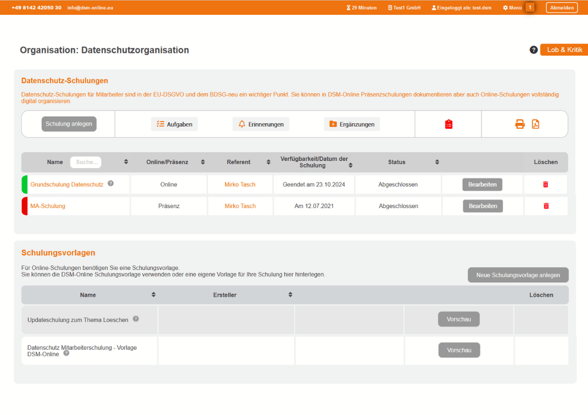 Mit unserem Modul für Datenschutzschulungen organisieren und verwalten Sie Präsenz- und Online-Schulungen schnell und unkompliziert. Nutzen Sie praktische Vorlagen, um Schulungen professionell zu planen und lückenlos zu dokumentieren. Ob individuelle Präsenztermine oder flexible Online-Schulungen – mit unseren Workflows behalten Sie stets den Überblick und sorgen für eine nachhaltige Wissensvermittlung.