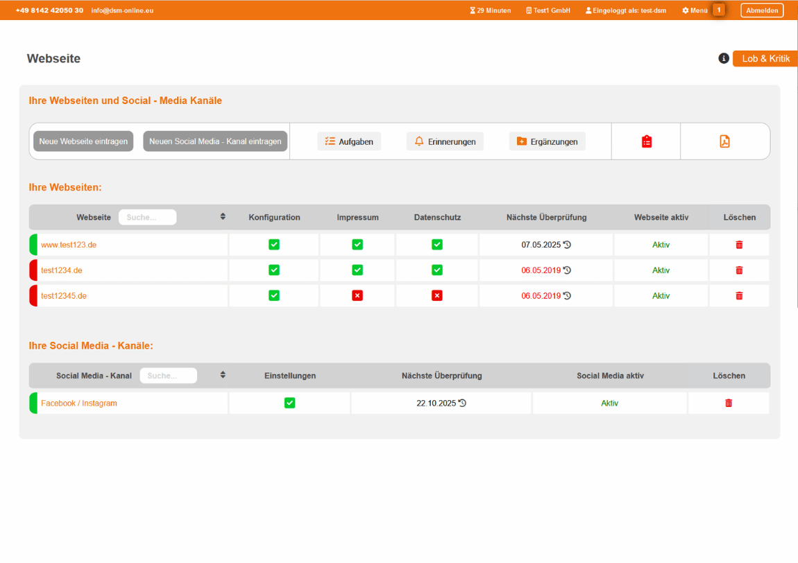 Im Modul Webseite / Online-Kanäle verwalten Sie alle datenschutzrelevanten Aspekte Ihrer Online-Auftritte – von der Webseite bis zu Social Media-Kanälen. Dokumentieren Sie den Datenschutz Ihrer Plattformen und weisen nach, dass Sie datenschutzkonform arbeiten. Zukünftig können Sie auch eigene Apps strukturiert dokumentieren.